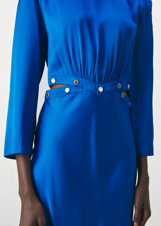 Sandro Paris I Elegantes Satin-Maxikleid mit Zierknöpfen – Kobaltblau